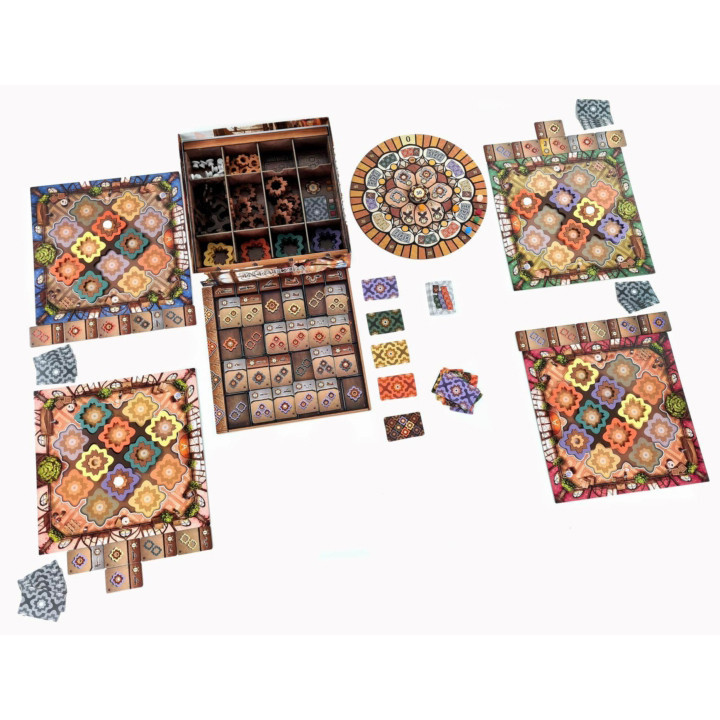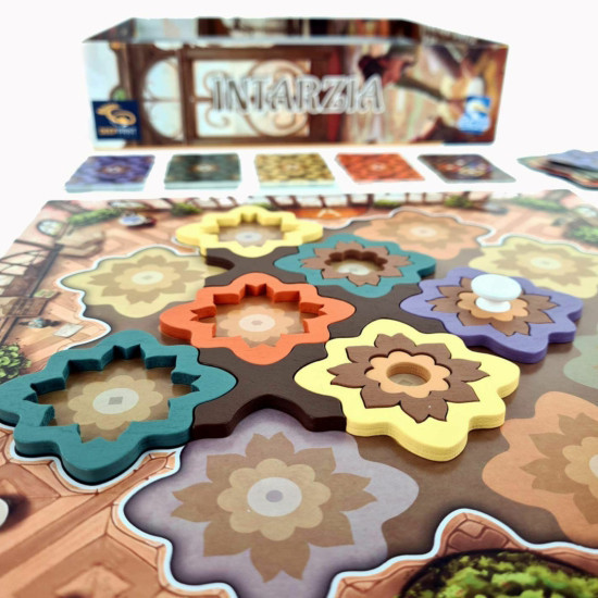 Az Intarzia Michael Kiesling, az Azul tervezőjének legújabb családi társasjátéka, ahol versenybe szállhattok, hogy ki készít el egy látványosabb (és persze pontban értékesebb) intarziás padlót a híres Café de Paris számára.
