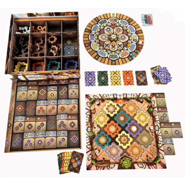 Melyikőtök rak ki csodásabb intarziás padlót? Az Intarzia Michael Kiesling, az Azul tervezőjének legújabb családi társasjátéka, ahol versenybe szállhattok, hogy ki készít el egy látványosabb (és persze pontban értékesebb) intarziás padlót a híres Café de Paris számára. A terveket egymással versengve fogjátok elkészíteni, ügyesen kiválasztva az anyagkártyákat és padlóelemeket. A különböző méretű, egymásba passzoló padlóelemek értékességét a szerszámlapkák határozzák meg – amelyeket megszerzésük után még értékesebbé is tehettek! Minden padlódísz 1-4 különleges faelem kombinációjából állhat, amelyeket kívülről befelé haladva kell elhelyeznetek. Minél összetettebbek a terveitek (tehát minél több elemből áll a padlódísz), annál több győzelmi pontot zsebelhettek be. Csak a legügyesebb építők biztosíthatják be a szerződést, és adhatnak új életet a kávézónak! Készen állsz a kihívásra? Merülj el az intarziák varázslatos világában, és bizonyítsd be, hogy te vagy a legjobb tervező! A Café de Paris felújítása csak rád vár!