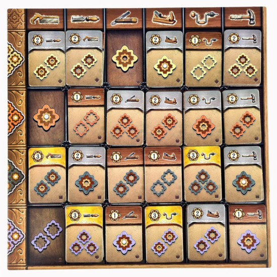 A terveket egymással versengve fogjátok elkészíteni, ügyesen kiválasztva az anyagkártyákat és padlóelemeket. A különböző méretű, egymásba passzoló padlóelemek értékességét a szerszámlapkák határozzák meg – amelyeket megszerzésük után még értékesebbé is tehettek!