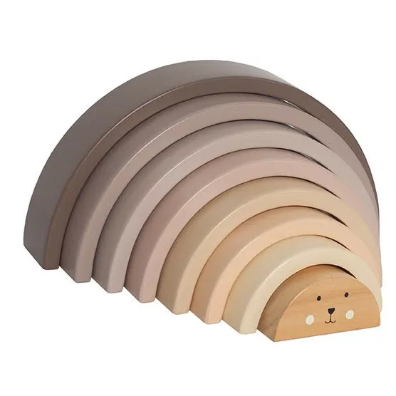 Aranyos készségfejlesztő szivárvánnyal toronyépítő játék, melynek középső elemén egy kedves kis maci arca látható. A játék elemeivel külön-külön is játszhatnak a gyerekek vagy akár egymásra is pakolhatják azokat, így egy nagy tornyot hozhatnak létre. Az elemekből továbbá izgalmas alagutakat vagy hidakat lehet építeni a kedvenc autókkal történő játékhoz! A használatához csak a gyermeki képzelet szab határt.