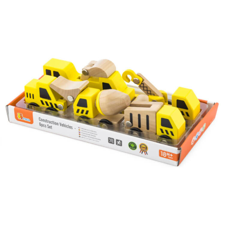 Gyönyörű formatervezésű járműkészlet szépen festett és lekerekített élekkel, sarkokkal és kerekekkel. A készlet dömpert, 2  markolót ( tolólapos és hidraulikus ), úthengert, darut és betonkeverőt tartalmaz.