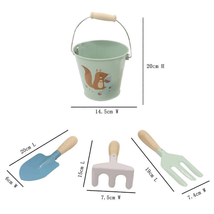 Kerti szerszámok vödörrel. Elengedhetetlen kellék a homokozáshoz. A homokozás fejleszti a kreativitást és a finommotorikus készségeket. Kiváló eszköz szerepjátékokhoz.