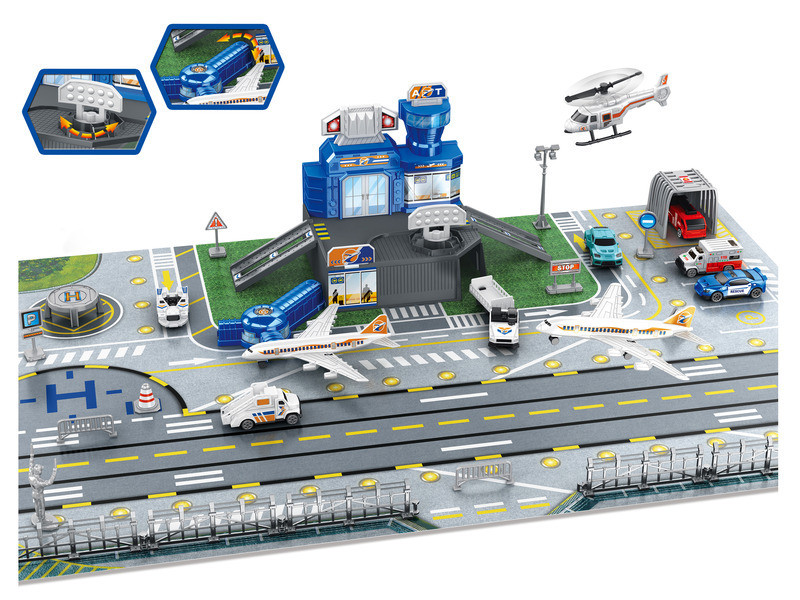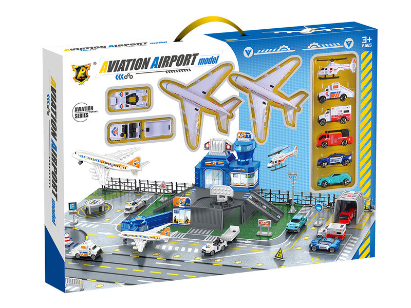 A szett autókat, repülőgépeket, helikoptert és egy komplett parkolóházat tartalmaz