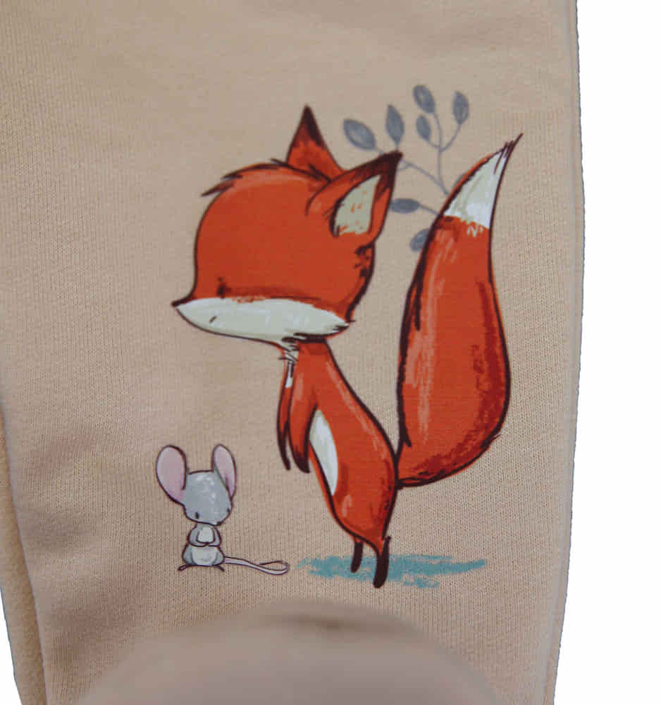 Belül bolyhos pamut kisfiú baba nadrág rókás mintával Puha, meleg és kényelmes - ez a belül bolyhos pamut kisfiú baba nadrág a legjobb választás a hidegebb hónapokra. Homok színű nadrágban a kis huncutok ellenállhatatlanul cukik lesznek, míg a rókás minta még a legkomorabb napokon is mosolyt csal az arcukra. Az elasztikus gumis derék könnyen alkalmazkodik a babák mozgásához, biztosítva a tökéletes illeszkedést és kényelmet. A lábfejes kialakítás pedig segít megtartani a meleget a kicsik lábán. Könnyen kezelhető, szín- és formatartó minőségi anyagból készült, így tökéletes választás azok számára, akik szeretnének egy praktikus, mégis stílusos darabot a babájuk szekrényébe. Könnyen kezelhető és mosható, szín- és formaálló. I. osztályú minőségű, kiváló magyar termék. Anyaga 65% pamut és 35% poliészter