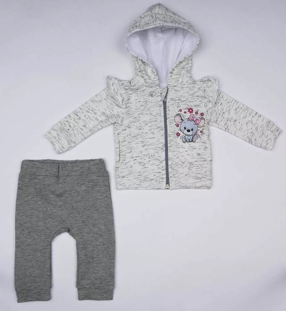 Kétrészes kislány szabadidő szett Egérke mintával Kényeztesse kislányát ezzel a két darabos, Egérke mintás szettel. A szett nyers színű, éppen olyan cuki, mint a rajta lévő karakter. A szett egy kapucnis cipzáras felsőből és egy elegáns nadrágból áll, amelyek finom részletekkel, minőségi kidolgozással és visszafogott nyomással készültek. A fodrok, a vékonyított passzé kidolgozás eleganciát kölcsönöznek az összeállításnak. Az anyaga vékony minőségi pamut poliészter, amely szín- és formatartó, valamint jól bírja a mosást. A szett csinos, mégis sportos, jól variálható, és garantáltan a kislányok kedvence lesz. Minőségi magyar termék Anyaga: 65% pamut, 35% poliészter Minőség: I. osztály