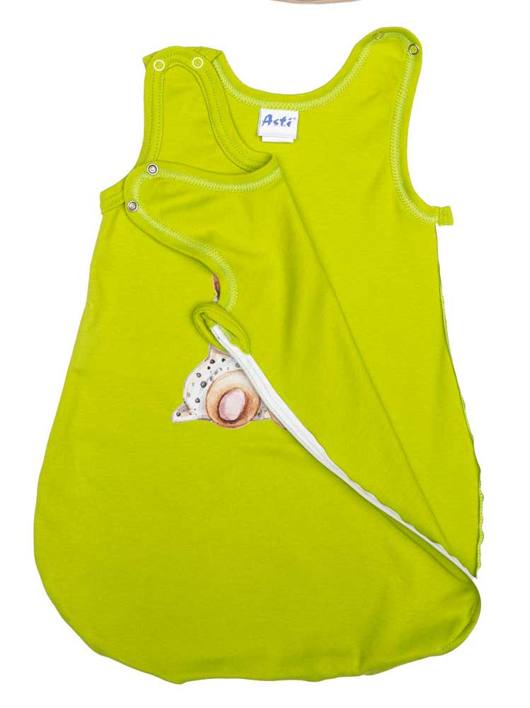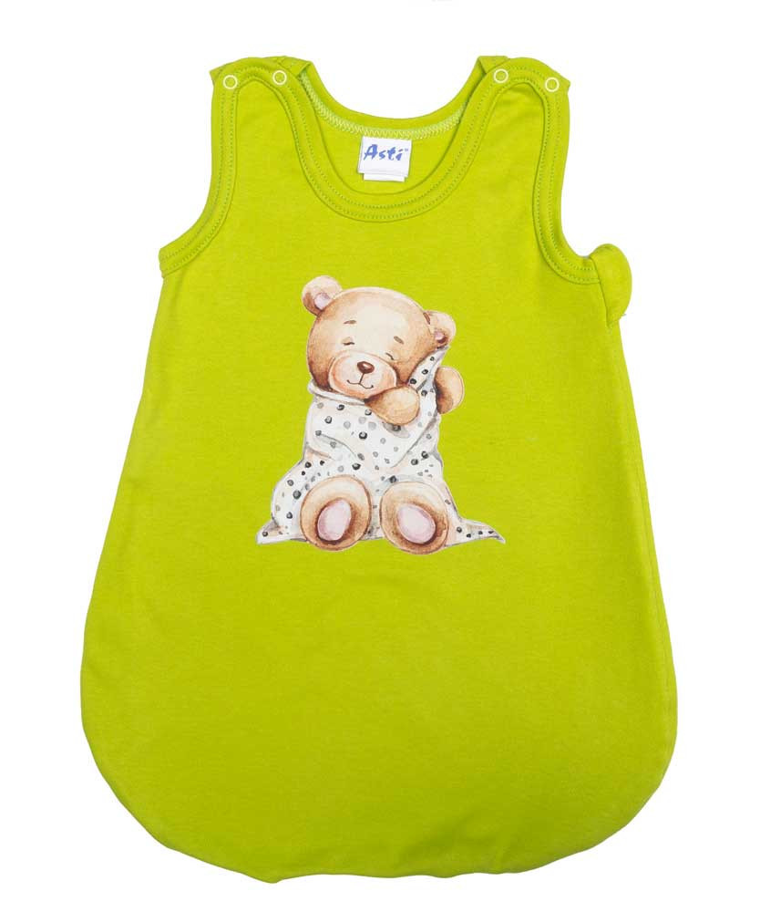 Ujjatlan vékony pamut hálózsák Macis mintával 1 TOG Öltöztesse álomba kisbabáját ebben a zöld, macis mintás, ujjatlan hálózsákban! Az oldalt cipzáras, vállon patentos kialakításnak köszönhetően könnyedén felvehető és levehető, így az éjszakai pelenkázás sem lesz gond. A hálózsák 100% pamut anyagból készült, ami puha érintésű és légáteresztő, így a baba éjjel-nappal kényelmesen és biztonságosan tud majd aludni. A minőségi magyar termék érzékeny bőrű babák számára is ideális, hiszen nikkelmentes patenttal készült, ami nem vált ki allergiás reakciót. A 1 TOG értékű hálózsák tökéletes választás melegebb hónapokra. Segítünk a választásban: táblázatunk segítségével könnyedén kiválaszthatja a megfelelő hálózsákot az évszaktól és a hőmérséklettől függően.