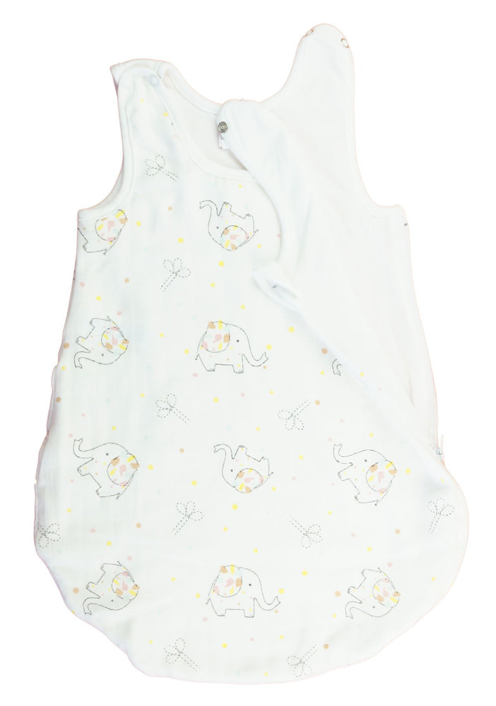 Ujjatlan vékony tetra hálózsák Elefént mintával 1 TOG Öltöztesse álomba kisbabáját ebben az elefánt mintás, ujjatlan hálózsákban! Az oldalt cipzáras, vállon patentos kialakításnak köszönhetően könnyedén felvehető és levehető, így az éjszakai pelenkázás sem lesz gond. A hálózsák 100% pamut tetra anyagból készült, ami puha érintésű és légáteresztő, így a baba éjjel-nappal kényelmesen és biztonságosan tud majd aludni. A minőségi magyar termék érzékeny bőrű babák számára is ideális, hiszen nikkelmentes patenttal készült, ami nem vált ki allergiás reakciót. A 1 TOG értékű hálózsák tökéletes választás melegebb hónapokra. Segítünk a választásban: táblázatunk segítségével könnyedén kiválaszthatja a megfelelő hálózsákot az évszaktól és a hőmérséklettől függően.
