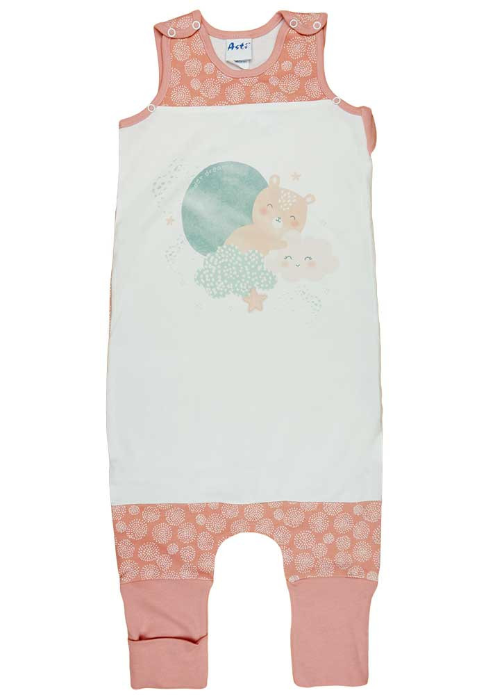 Macis mintával nyomott oldalt cipzáras, vállon patentos, lábfejnél ráhúzható, ujjatlan pamut tipegő hálózsák.
