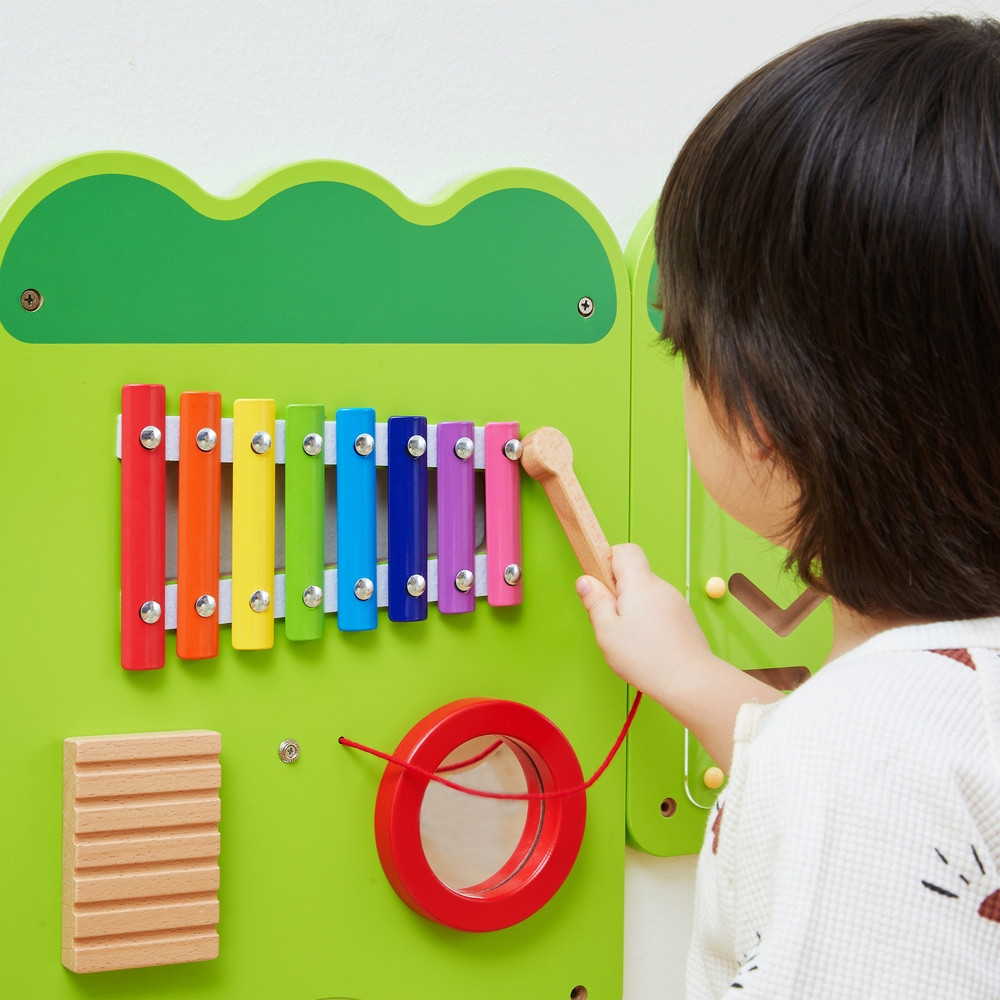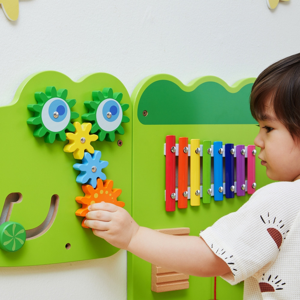 Ez a szerethető, krokodil mintás falpanel egyetlen eszközben kínál változatos, aktív felfedezést. A falra szerelhető kialakítás helyet spórol, a padló szabadon marad, a gyerekek pedig biztonságos, rendezett környezetben próbálhatnak ki különböző finommotoros és zenei élményeket.