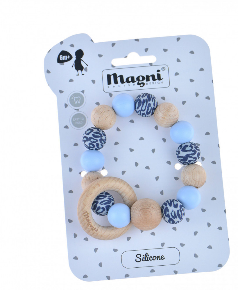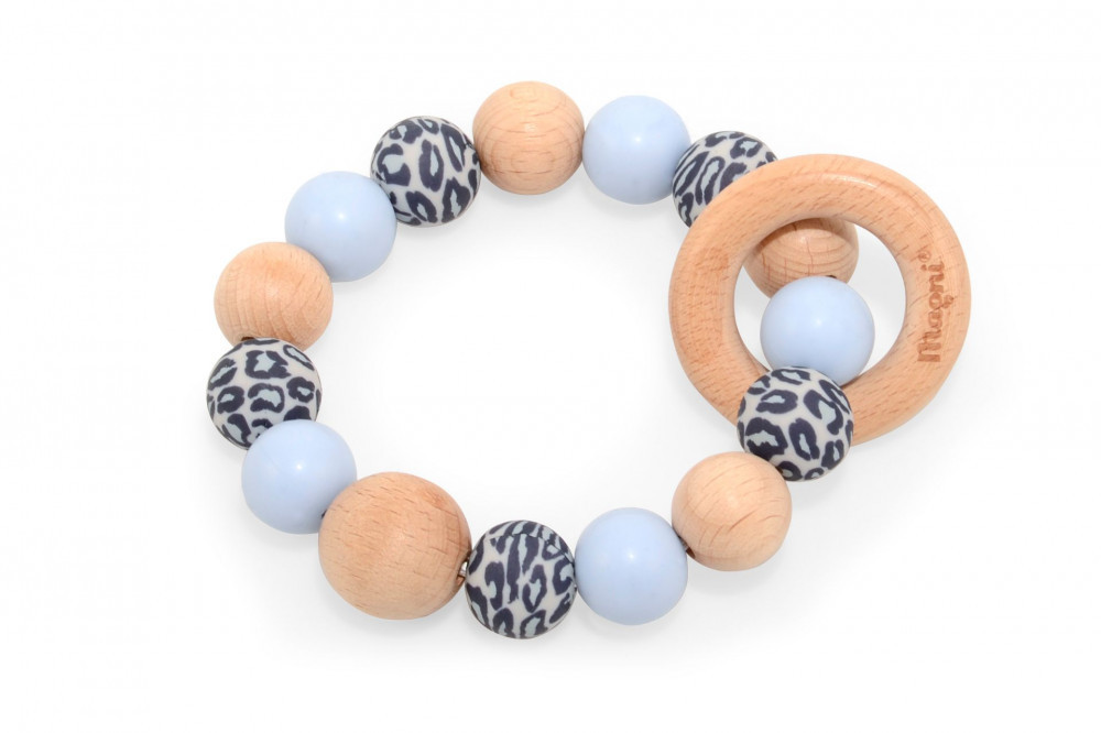 Színes rágóka szilikonból és fából, leopárd mintás/kék