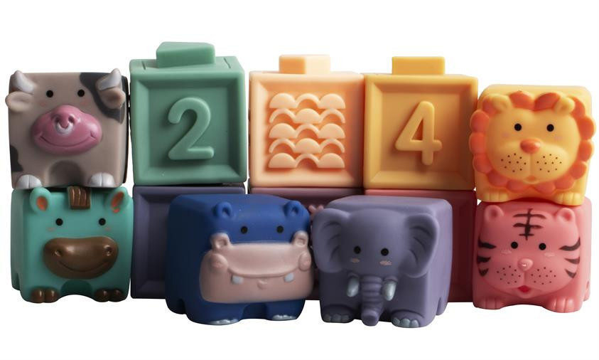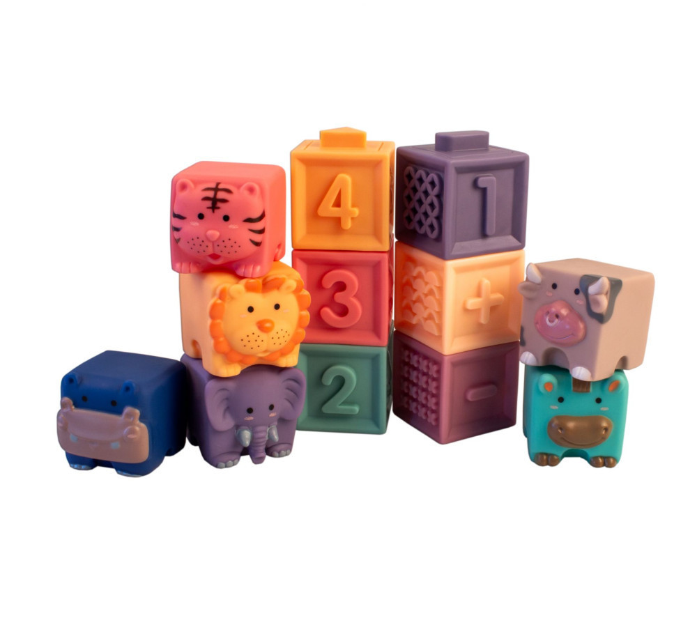 Szilikonból készült, szép és megnyugtató színekben pompázó, egymásra rakosgatható építőkockák a legkisebbek számára. A készlet 6 db kockából és 6 db játékfigurából áll. A rakosgatható blokkok a különböző színekkel, mintákkal és felületekkel stimulálják a gyermekek érzékeit, valamint fejlesztik a finommotoros készséget, a térlátást, kéz-szem koordinációt. A játék során a gyerekek megismerkedhetnek a számokkal, formákkal, állatokkal és mintákkal is.