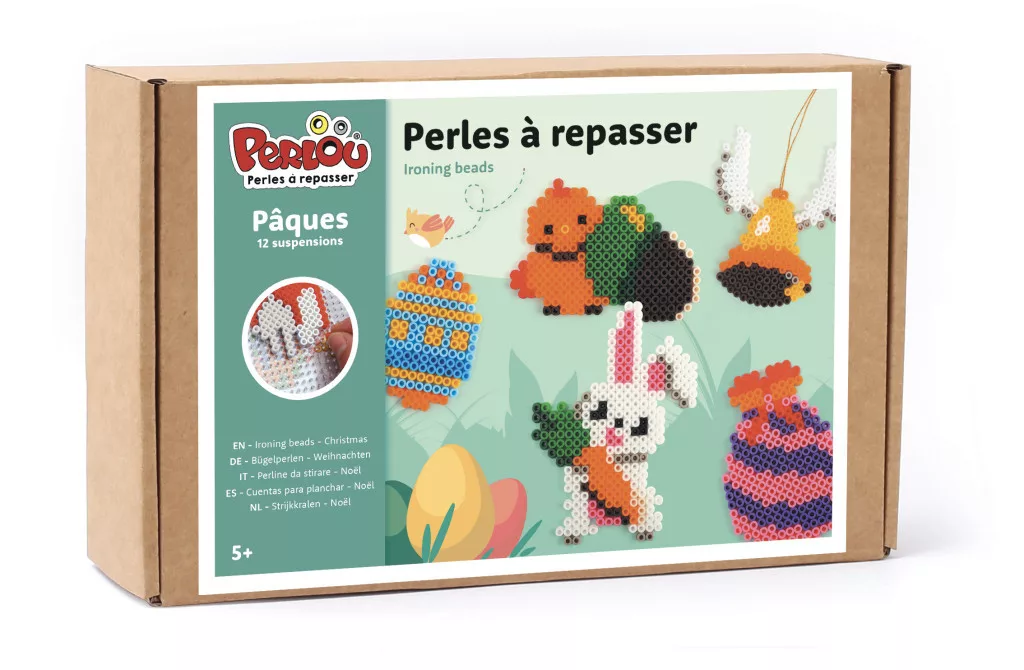 Készíts húsvéti dekorációkat vasalható gyöngyökből! A készlet segítségével tojások, nyuszik és csibék készíthetők, amelyeket arany fonallal fel is lehet akasztani.