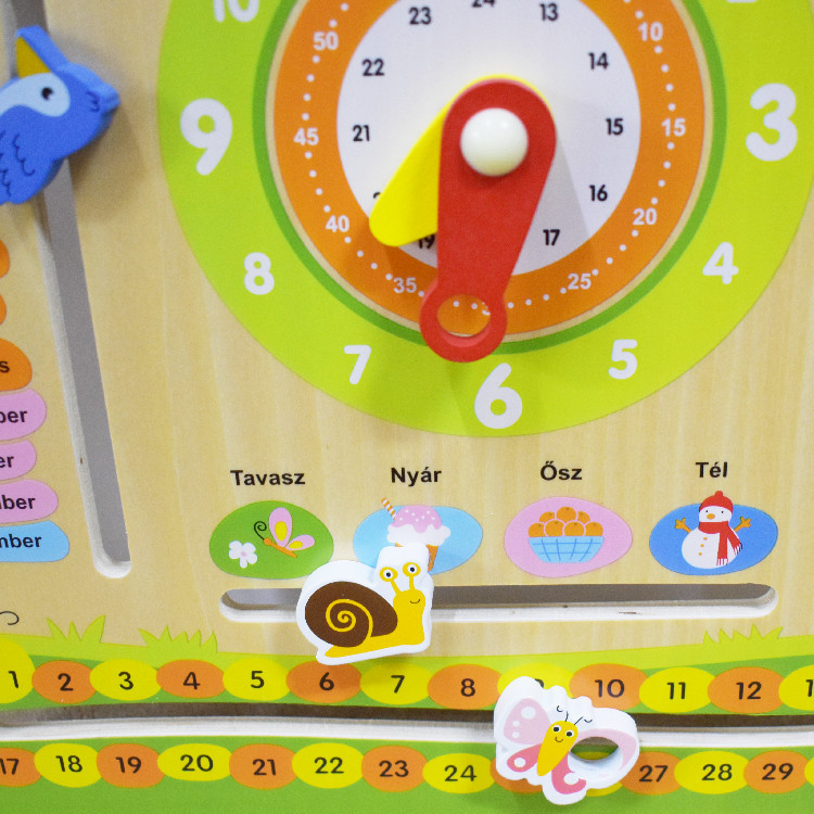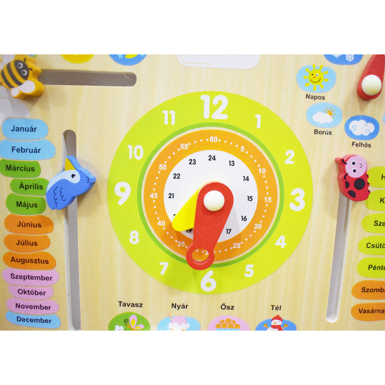Ezzel a hatékony, színes fanaptárral kicsik és nagyok is könnyedén megismerkedhetnek az évszakok, hónapok, napok múlásával, valamint az időjárás és az óra beazonosításával. Ezzel a színpompás kis szerkezettel felzárkózhatsz az iskolában, gyakorolhatod vagy előre felfedezheted az idő csínját-bínját!